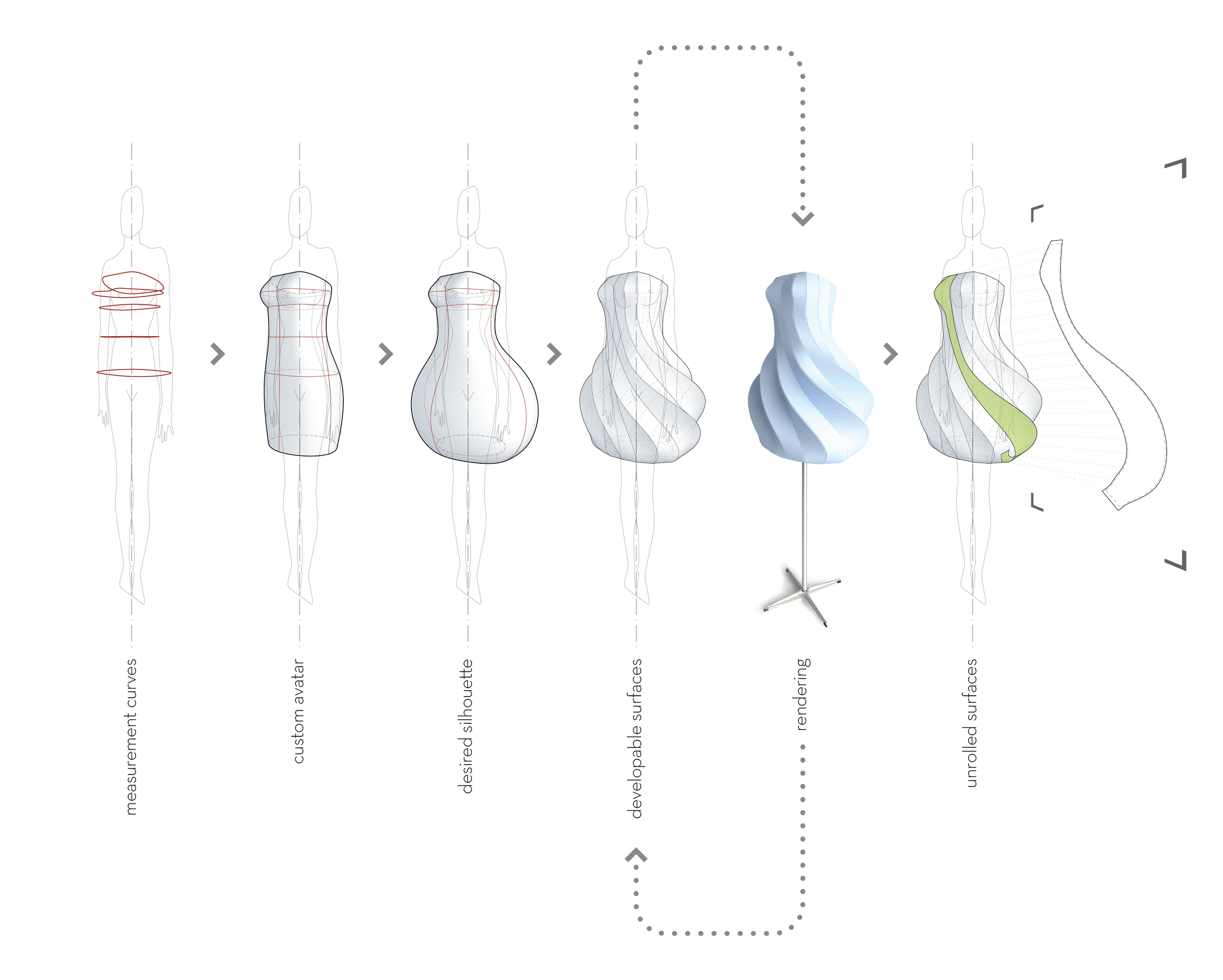 For the architect, the digital era has transformed the process of design and fabrication, fueling the fire of rebellion against the standardized construction unit. Today, the architect dreams of efficient transformations, parametric constraints, and developable surfaces… borrowing, oftentimes recklessly, sartorial techniques and language from the fashion industry—darting, draping, patterning. Why then do architect’s contemporaries in fashion design still surround themselves with dress forms and work tables? There is a clear disconnect between the methods of working and the moments of progress within the respective fields. The fashion industry is still split between made to measure couture, and the prêt-a porter S-M-L-XL and numerically coded standardized sizes. When viewed in comparison, the architecture field and the fashion industry have become uniquely successful at processes the alternate field struggles to get right. This potential synergy is seemingly apparent and useful; however, little interaction occurs at the pedagogical level beyond superficial discussions and conceptual leaps. As Architects take this opportunity to reflect on how the digital process has affected their practice, we have the opportunity to engage a similar process that has yet to take the digital leap. The Drawn Dress project is a speculative research venture charged with the task of designing, developing, and constructing a digitally drawn dress. This comparative process serves as a catalyst to rarify architectures contribution in the digital era.