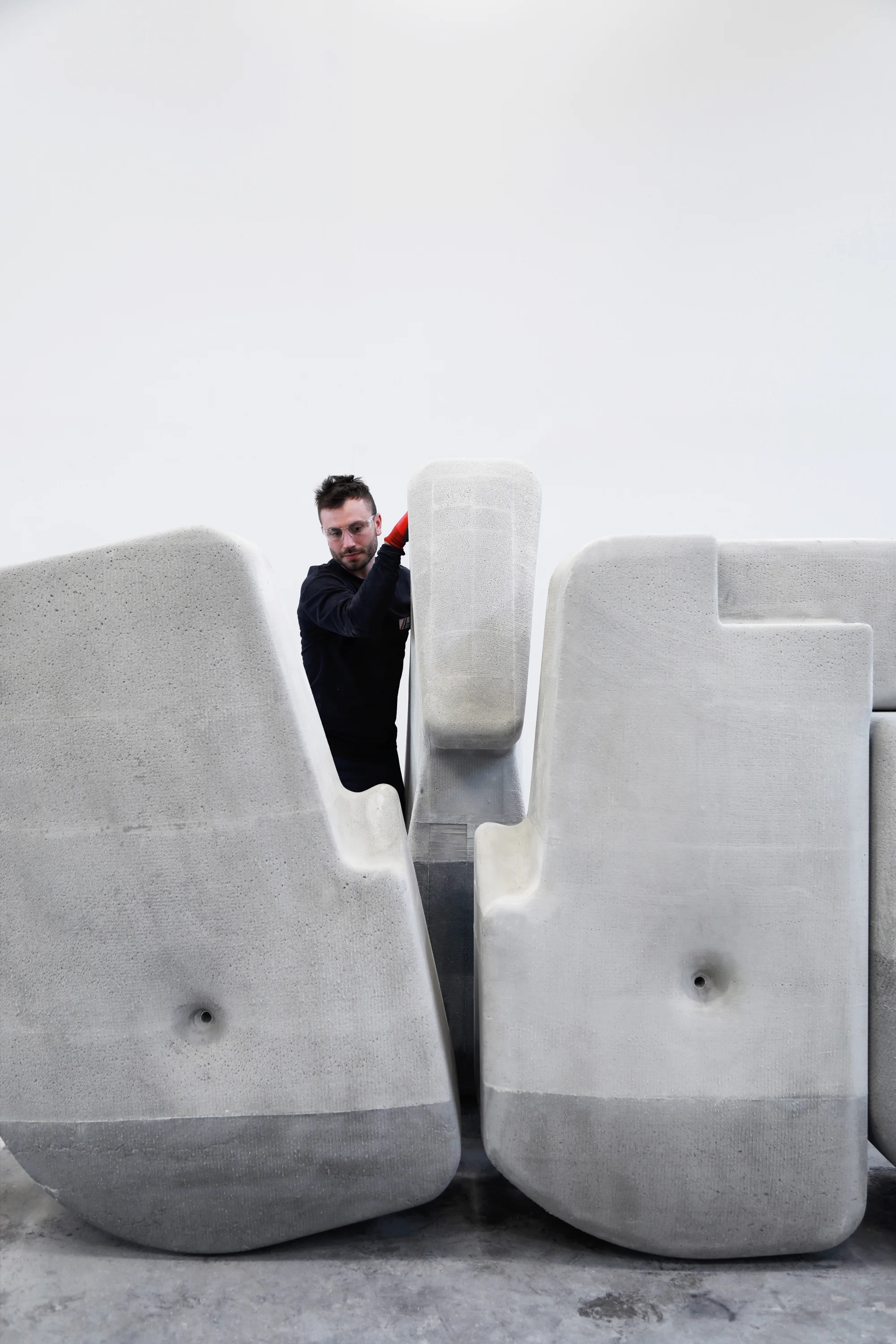 The mysterious knowledge surrounding the transportation and placement of megalithic structures of the past eludes contemporary building practices. Walking Assembly re-introduces the potentials of that ancient knowledge to better inform the transportation and assembly of future architectures. If a brick is designed for a single hand, and a concrete masonry unit (CMU) is designed for two, these massive masonry units (MMU) unshackle the dependency between size and the human body. Intelligence of transportation and assembly is designed into the elements themselves, liberating humans to guide these colossal concrete elements into place. Structures that would otherwise rely on cranes or heavy equipment can now be intelligently assembled and disassembled with little energy. By using variable density concrete, the center of mass of the object is calibrated precisely to control the stable, but easy motion of the elements. This ensures that these massive elements successfully walk and assemble into place, creating the possibility for a crane-less tilt up construction method and turning our building sites into spectacles of play.